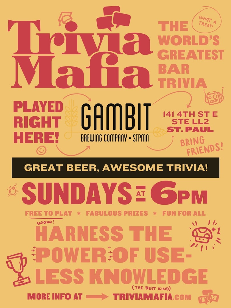 Trivia Mafia is at Gambit Brewing every Sunday at 6pm. Trivia Mafia (aka the world’s best bar trivia) is a bar and brewery trivia operation based in Minneapolis, Minnesota. Each session is comprised of 8 rounds, including an image and a sound round, and since we prefer things old-school, we still do pen-and-paper style at Gambit. Plus, the top three winners each week will go home with a prize!