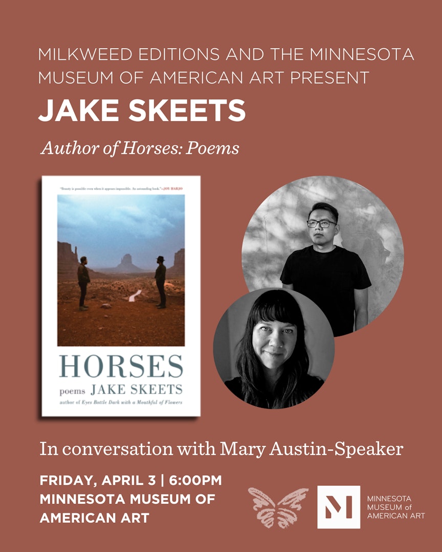 Join Jake Skeets at Minnesota Museum of American Art in conversation with Milkweed’s Creative Director Mary Austin-Speaker for a reading and discussion of his latest work, Horses. The reading and reception will be in celebration of the “Queering Indigeneity” exhibit.