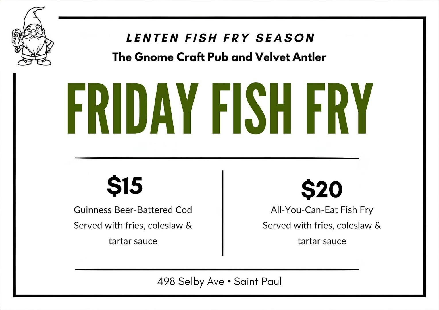 Friday Fish Fry at The Gnome498 Selby Ave